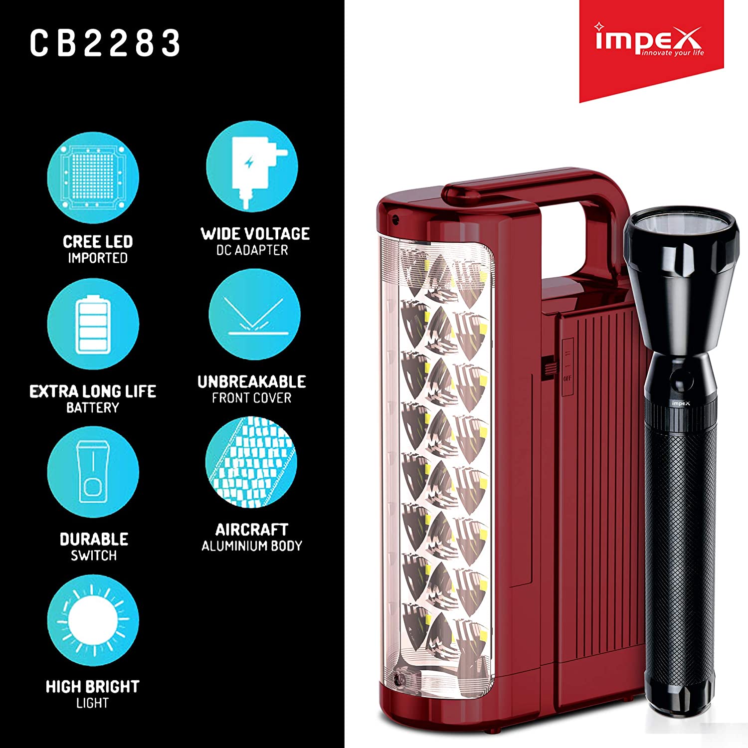 FLASHLIGHT. Aircraft non corrosive aluminium body. Durable switch. Powerful light beam. Working time : 3 - 4 Hrs. EMERGENCY LANTERN. 6V 4500 mAh rechargable battery. 24 Pcs super bright SMD LED. Charging time : 12 Hrs. Working Time : 7 - 24 Hrs.