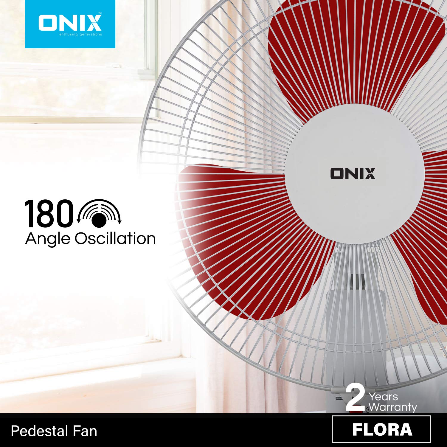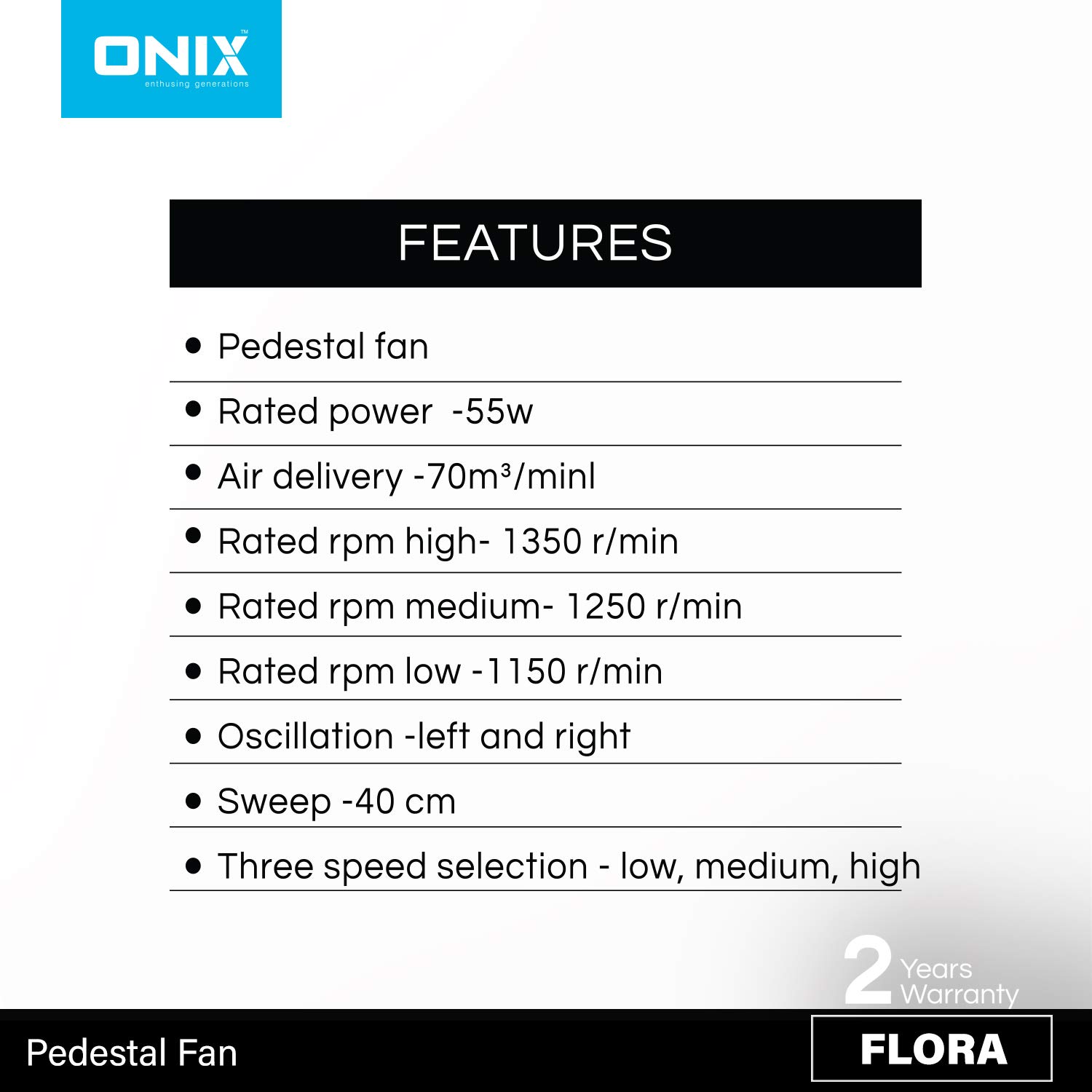 Pedestal Fan. 55 W. Sweep 40 cm. RPM 1350. Frequency 50 Hz. Voltage 220 - 240. Air Delivery : 70 m^3/m. 2 year warranty.