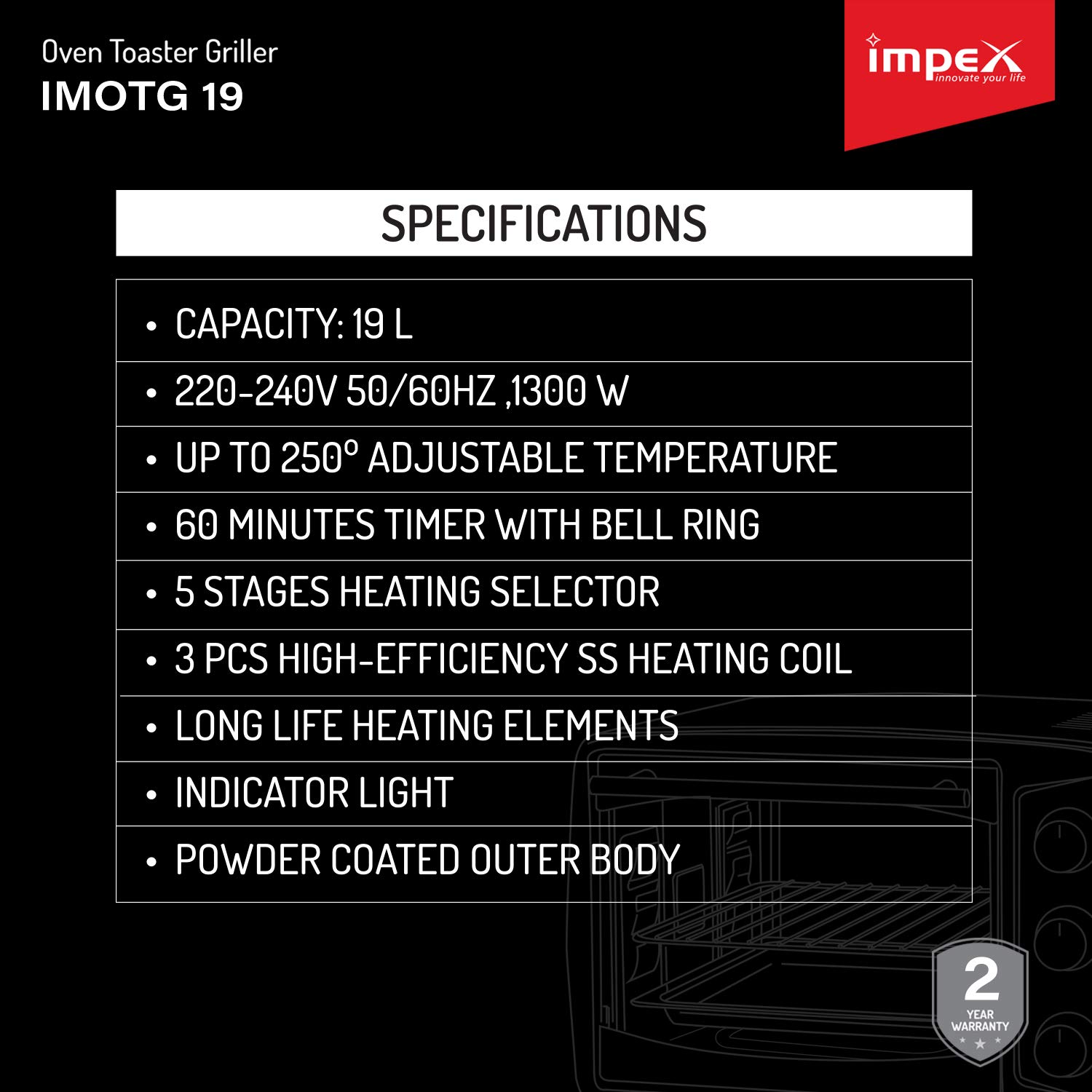 Oven Toaster Griller. 19 Ltr. Temperature control. Function Selector. Timer Control. Convention. 1300 W. 2 Year Warranty.